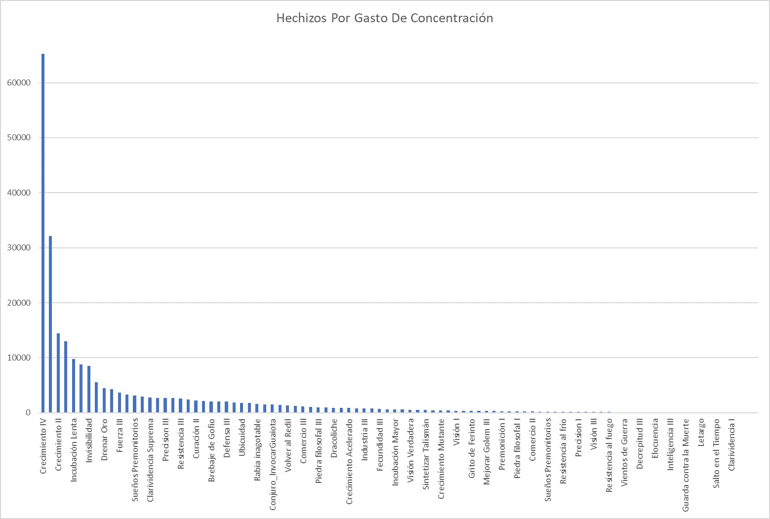 En las siguientes gráficas podremos ver la popularidad de los conjuros en cuanto a gasto de concentración así vemos visualmente la inmensa diferencia que hay entre el top 5 y el resto de conjuros.