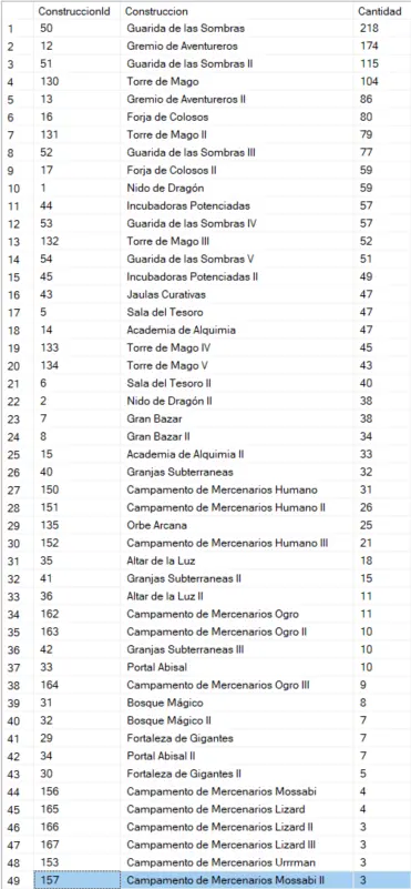 Podemos ver el gremio de las sombras sigue siendo el líder aunque la torre de mago se le acerca peligrosamente, en el anterior top la guarida de las sombras era mas del doble de veces mas construida que la siguiente familia de construcciones, que en aquel momento era cualquier campamento de mercenarios, el cual en esta ocasión ha decaído desde el top 2º al top 4º mientras que el gremio de aventureros ha subido desde el top 5º al top 3º. Desde luego el espacio para golems y los campamentos de mercenarios se han visto muy afectados en estos meses. Curiosamente las incubadoras potenciadas han subido desde el 8º hasta el 6º, realmente pensábamos que tendría una importancia aun mayor en este meta.