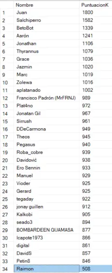 En esta ocasión, para variar, Jaxun sigue en el top 1, seguido de BetoBot y de Salchiperro. Tenemos que tener en cuenta que Jaxun tiene unos 200 puntos más que el 3º puesto y casi 100 puntos más que el 1º puesto.