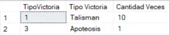 En esta ocasión el tipo de victoria sigue predomindando talismán en este caso en un 10 a 1. Es decir un 90% de las partidas se ganan usando los talismanes y un 10% con apoteosis. Es lógico que el tipo de victoria de "conquista", es decir, matar al resto de jugadores, sea la que menos se dé por que es, con diferencia, la más difícil de conseguir ya no solo por las contingencias sino por que en el proceso de matarlos a todos puedes conseguir todos los talismanes "sin quererlo".