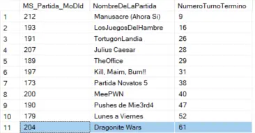 En este caso, la partida más rápida ha sido la última masacre "Manusacre (Ahora Si)" que terminó en el turno 9. La siguiente también es una partida del tipo masacre, "LosJuegosDelHambre".