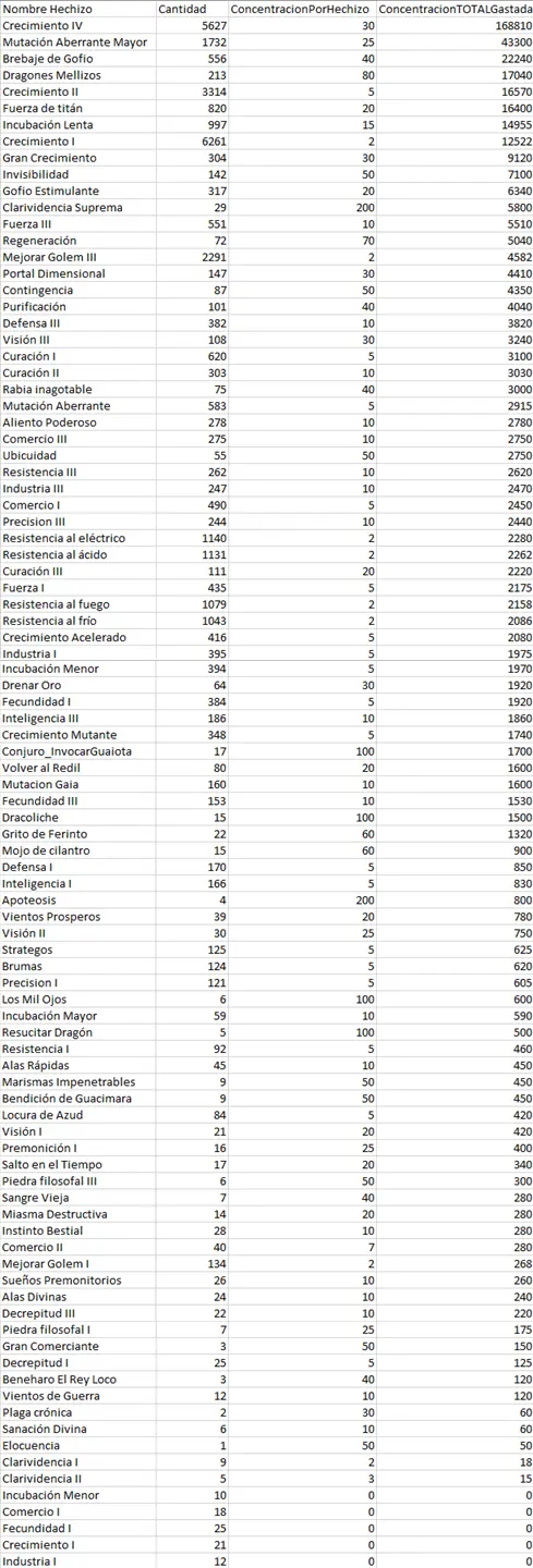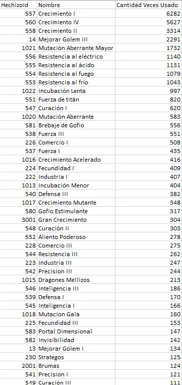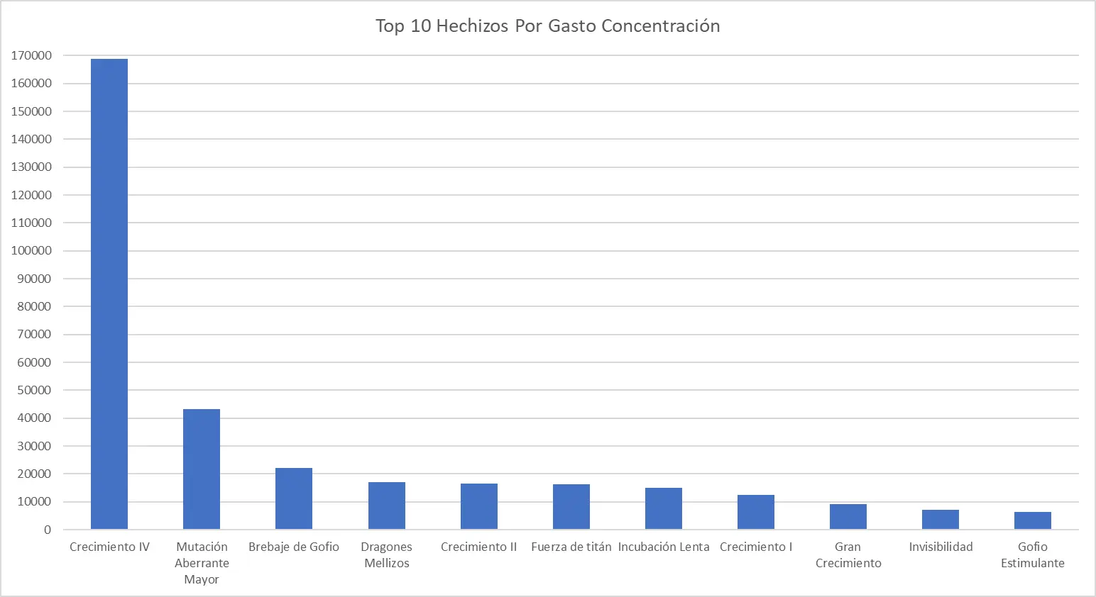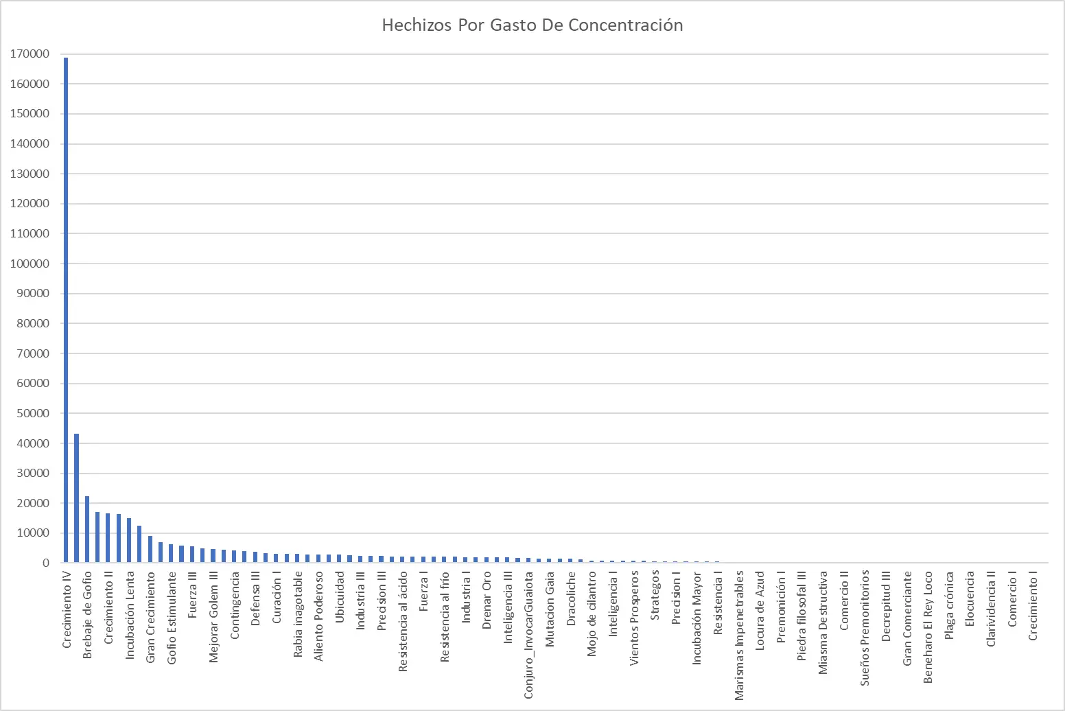 En este caso, vemos que el hechizo favorito de los jugadores para rellenar concentración sobrante es el Crecimiento II, y, que pese a costar mas del doble el crecimiento IV sigue siendo el segundo más usado.