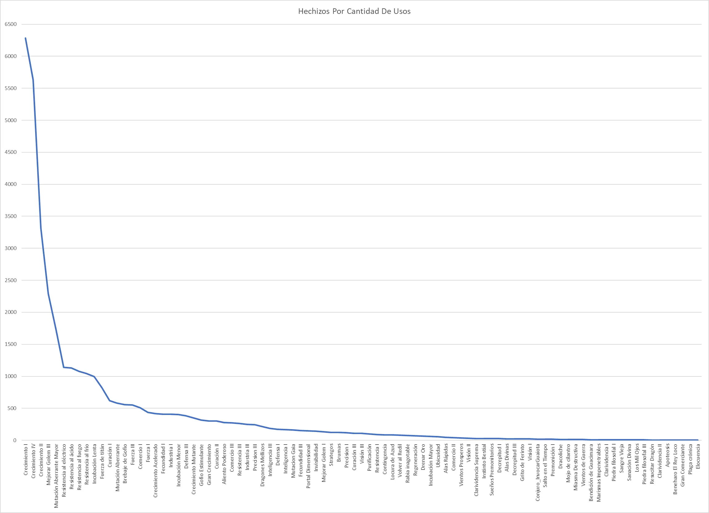 Ahora vamos a ver la popularidad de los conjuros atendiendo únicamente a la CANTIDAD de veces que los jugadores usan cada hechizo. Lógicamente esta forma de medir favorece a aquellos conjuros que sean mas baratos en concentración pero también puede darnos una idea de en qué conjuros gastan los jugadores esos puntitos de concentración que siempre sobran.