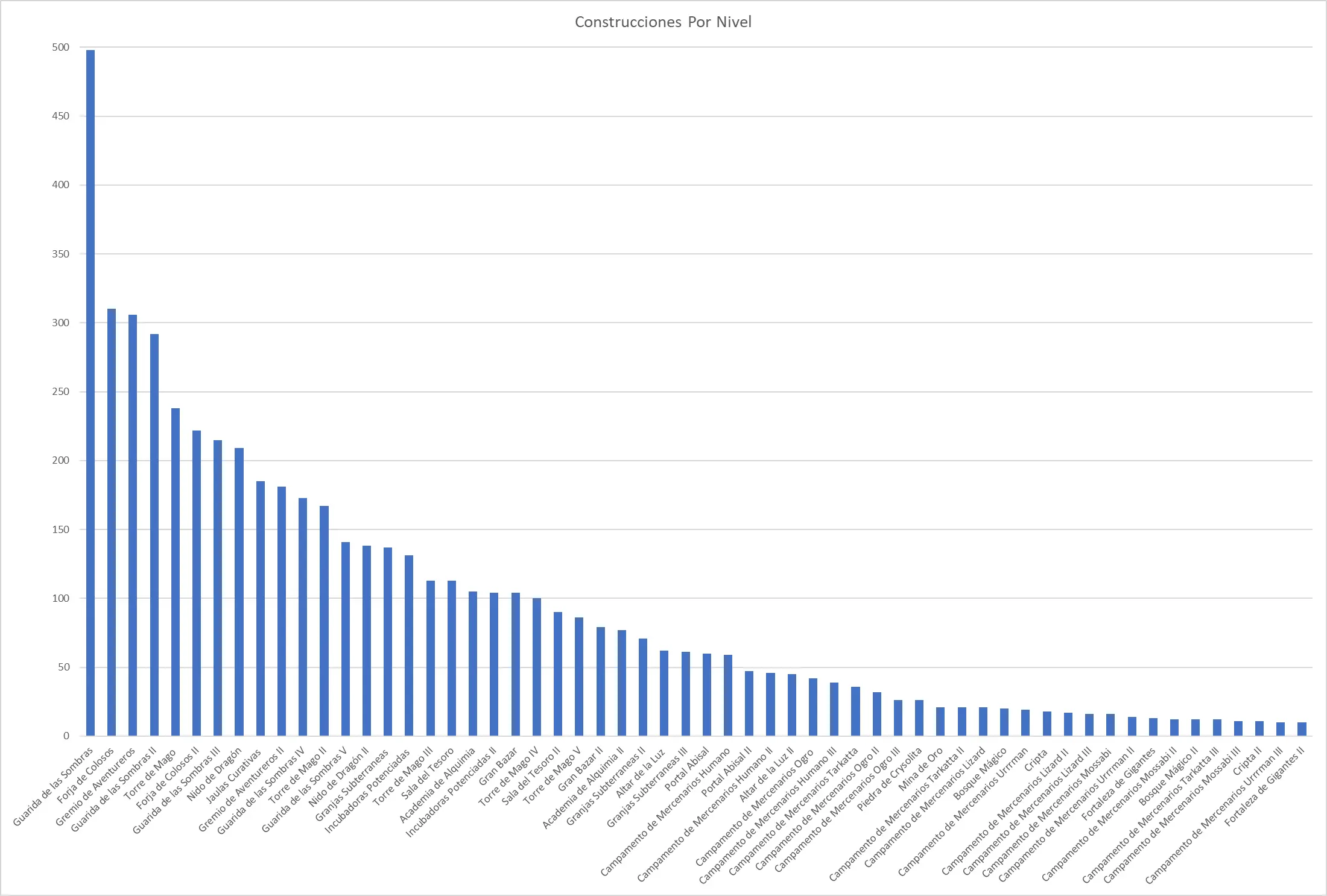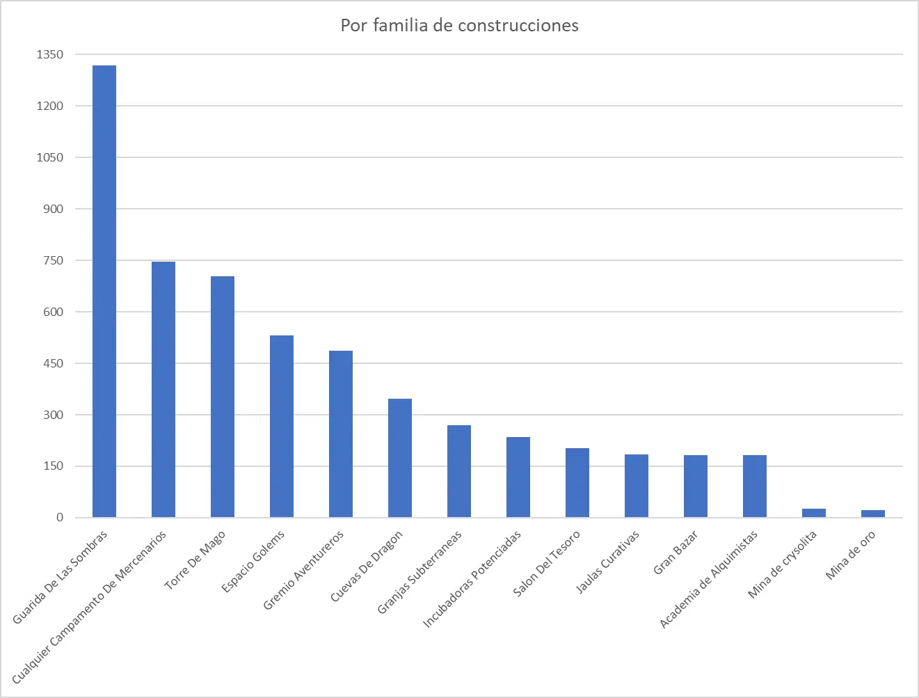 Para los nuevos, las "familias" de las construcciones quiere decir que hacemos el estudio considerando que "Gremio de las sombras I" y "Gremio de las sombras II" son el mismo elemento. En el siguiente apartado veremos la popularidad de CADA NIVEL de las construcciones.