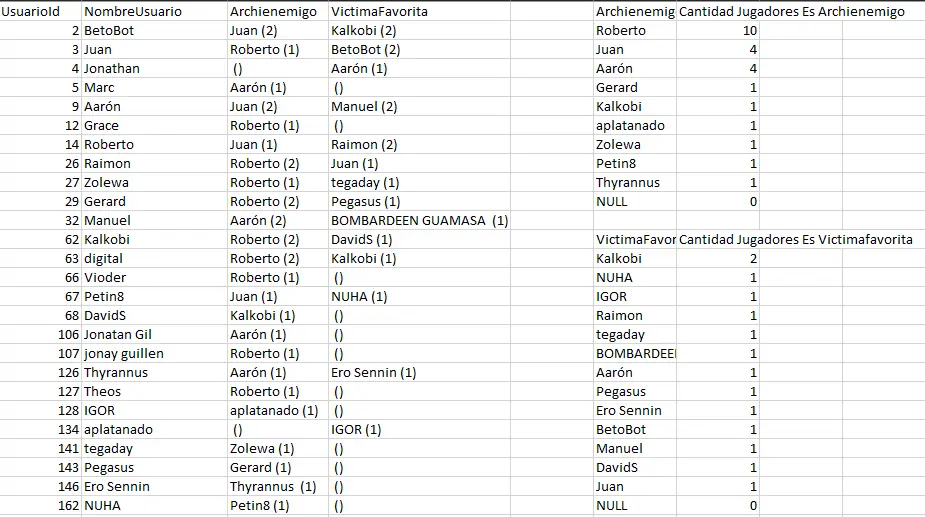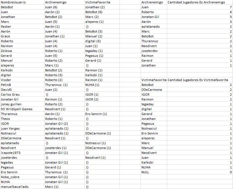 La víctima favorita más común hay un triple empate entre BetoBot, DDeCarmona, IGOR y Raimon siendo víctima favorita de 2 jugadores simultáneamente.
