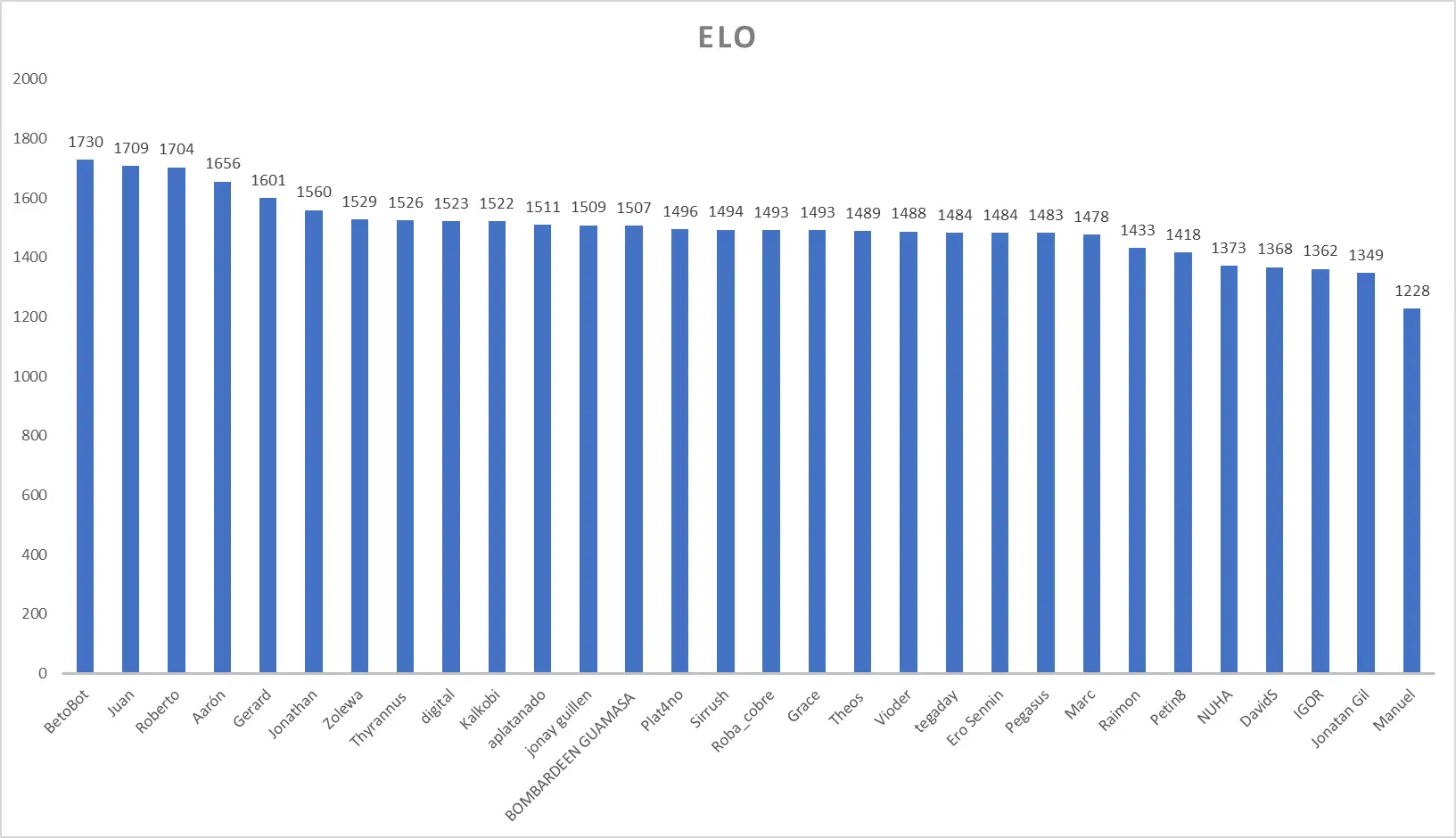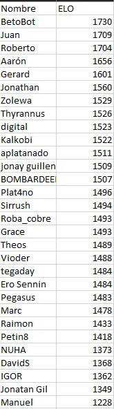 Podemos ver que el top 1 de ELO actualmente es BetoBot con 1730, seguido muy de cerca del archienemigo de la mayoría de jugadores Juan con 1709, luego le siguen Roberto con 1704 y Aarón con 1656... Para finalizar el top 5 jugadores tenemos a Gerard, el ganador del torneo del Gran Alquimista con 1601 puntos.