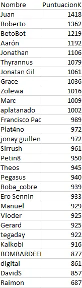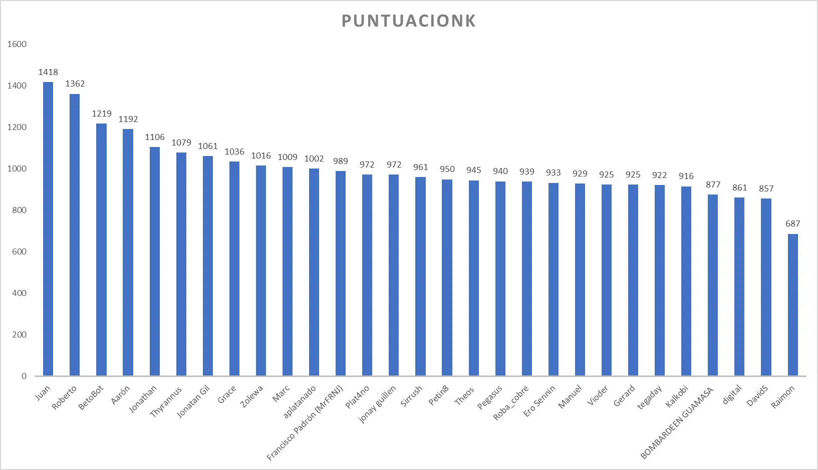 Podemos ver que el top 5 está, Juan con 1418, el archienemigo predilecto, seguido de Roberto con 1362, BetoBot con 1219, Aarón con 1192 y para cerrar el top 5 como ya habíamos mencionado, tenemos a Jonathan con 1106 puntos.