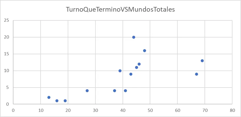 Parece que hay una tendencia de a mayor número de mundos más turnos requiere para terminarse pero no parece que sea lineal, nos faltan más datos para poder analizarlo correctamente.