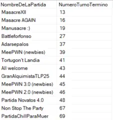 Las partidas son: PartidaChillParaMuer, MasacreXII, Battleforfonso, JuanXAaron, Non Stop The Party, VladimirvsKayle, DragonHunt2, All welcome, BattleRoyaleBecarios, Adarsepalos, Partida Novatos 4.0, Masacre AGAIN, Tortugon't Landia, For FUN, MeePWN 3.0 (newbies), GranAlquimistaTLP25, MeePWN 2.0 (newbies), MeePWN (newbies), Manusacre :)