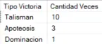 Ocupando un 71.42% de las veces, seguida de apoteosis con un 21.42% de las veces y por último "dominación" que es acabar con todos los jugadores de la partida. Es normal que "dominación" siempre esté a la cola de las formas de victoria por que normalmente al matar al resto de jugadores se prioriza la obtención de talismanes ganando por talismán en el proceso.