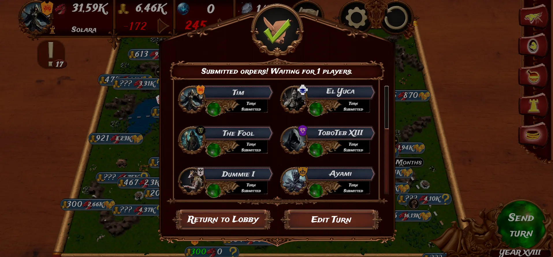 Sending your turn or entering a multiplayer match after your turn has already been submitted will now display a list of players in the match along with an indicator showing whether each player has submitted their turn.